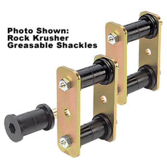 Looking for heavy duty replacement shackles for your CJ or '87-'95 Wrangler? Look no further. These new bolt together greasable shackles from Rock Krusher are the perfect solution. The bolt together design allows for springs to flex for better articulation! Feature greased grooved polyurethane bushings with greasable bolts. Constructed of two 1/4ö thick plates and include shackle bushings. Choose either red or black bushings. Rock Krusher Greasable Shackles for 3/4 Lift for 1976-86 CJ vehicles