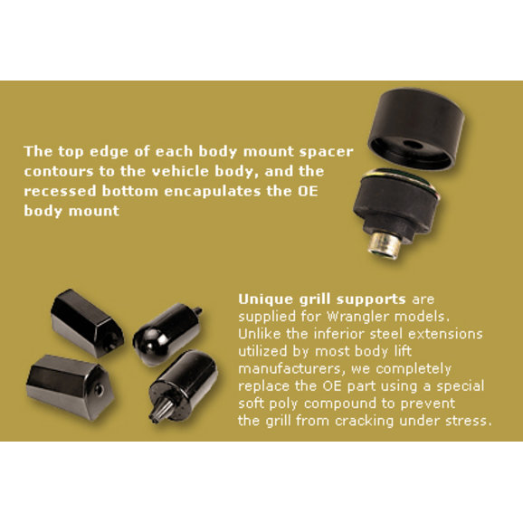 Manufactured from premium Dura-Thane poly material with a hardness of 94 durometer, JKS B1 Body Lifts are designed to easily exceed the demands of four wheeling.