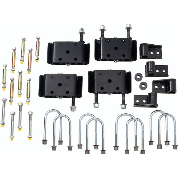 Kit includes custom U-bolt spring plates with skids; all necessary U-bolts; greasable shackle bushings; greasable spring pivot bushings and the proper spring perches. Please note that these kits will require Wrangler leaf spring shackles of your choice-sold separately. We have many options available for your consideration.This is for CJ with model 20 rear axle.If Jeep has model 44 rear axle it will need different ubolts, nuts, and washers.