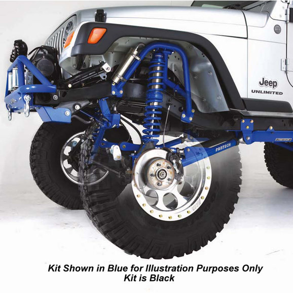 Fabtech's new TJ system is built for the hardcore rock crawler enthusiast demanding maximum ground clearance and articulation. These all new High Clearance Crawler Kits feature Radius Arm front suspension and a 3 Link rear system. Everything is connected by a 1/4" thick Transfer Case skid pan tucked up tight against the frame for incredible ground clearance. This system provides zero caster and u-joint angle change throughout the suspension cycle while providing more ground clearance at the link ends than any other system on the market!