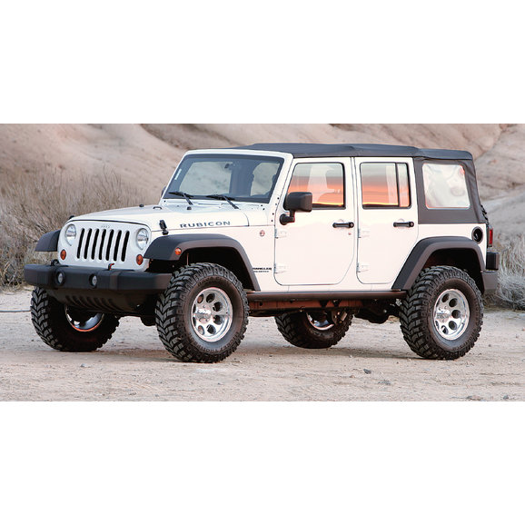 This system utilizes the factory coil springs with 3" steel coil spacers. With the vast array of cab and motor combinations found in the JK, utilization of the factory coil springs with this system ensures that the vehicle will receive a full 3 of lift to clear 35 x 12.50 R17 tires. This system includes a replacement Pitman Arm, front and rear Trac Bar relocation brackets, Sway Bar mounts, front and rear Bump Stop mounts and more. Proper front-end alignment is insured with this system due to the included adjustable alignment cams. Also included is a front driveshaft boot clamp kit to allow additional clearance between the front driveshaft and transmission during full suspension articulation.