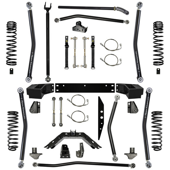 The Rock Krawler JK 4.5" X-Factor Long Arm Stretch System is the best performing trail suspension for JK owners looking to run 37", 38" or 40" tall tires with flat fenders. This system features the Rock Krawler Independent Three Link Conversion front and rear. The Independent Three Link's 100% bind free design has proven its self to be the best choice for those looking for maximum articulation while maintaining a factory like highway ride and tight handling.