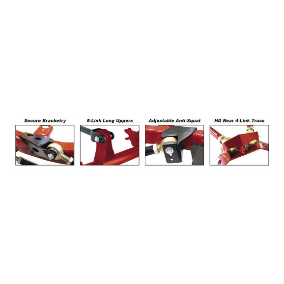 The PRO system uses the TJ traditional front five-link suspension configuration, but expands the performance. Our front upper arms are over 9 longer than stock arms