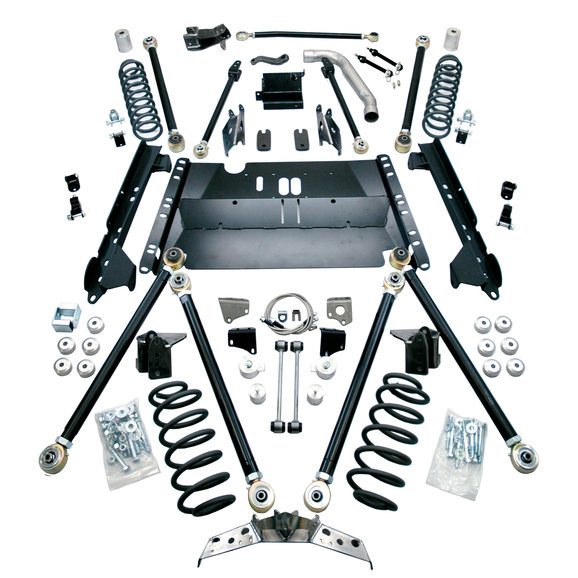 The PRO-LCG system is designed as a complete kit with all necessary componentry including lower long arms, front long upper arms & bracketry, rear 4-link long upper arms & bracketry, hardware and shocks. This complete kit will fit all TJ Wranglers including the Rubicon and Unlimited with Aftermarket & OEM axles (Dana 30, 35, 44 and Rubicon 44s).
