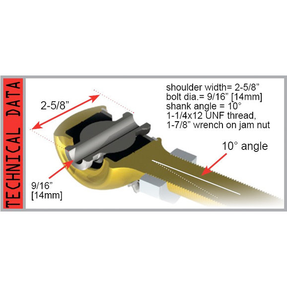 The forging uses standard 1-1/4 x 12 tpi. with a 9/16 center bolt. 10 degree angle off joint. Used on our JK Lower Control Arms for better Tire clearance in tight turns. Shoulder width= 2-5/8 Bolt dia.= 9/16 [14mm] Shank angle = 10° 1-1/4x12 Right Hand UNF thread, 1-7/8 wrench on jam nut