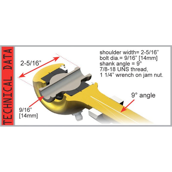 The angled rod end forging is designed for applications needing additional clearance for tires, or other frame configurations. The end utilizes a 7/8 x 18 tpi. shank and accepts a 9/16 bolt. The TJ Wrangler version features a 2" wide shoulder width while the JK version comes with a standard 2-5/16" shoulder width.