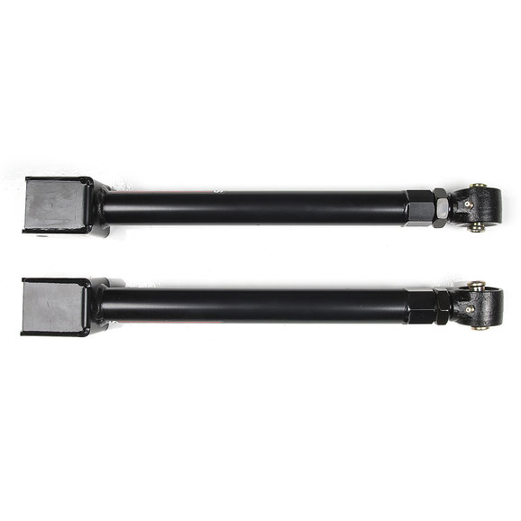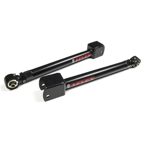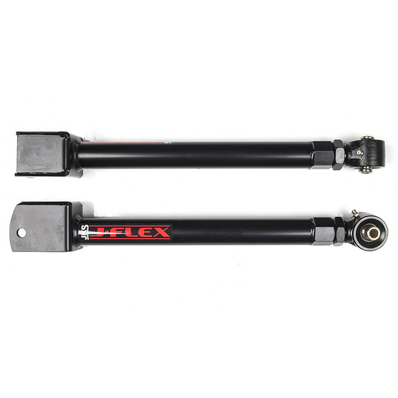 JKS Manufacturing Forged Series Adjustable Control Arms. These new arms follow a traditional Jeep adjustable arm design utilizing a forged adjustable flex end and jam nut setup for adjusting the length. The forged end is fully rebuildable and greaseable. 1-1/4-12 threads provide ultimate strength and fine-tune adjustability. The arms are made from DOM tubing and incorporate a unique hex shaped weld-in threaded bung for easy tightening of the jam nut. The arms also feature factory style rubber bushings at the non-adjustable ends for quite, maintenance-free operation. All arms are CNC formed for proper tire, frame and axle mount clearance. The durable and sleek all-black paint scheme provides a clean look. The small JKS oval decal lets everyone know you bought the best. All arms are designed for lift heights of 0-6. These new kits are a great together or as a complement to the JKS adjustable rotating arms in most any existing suspension system.