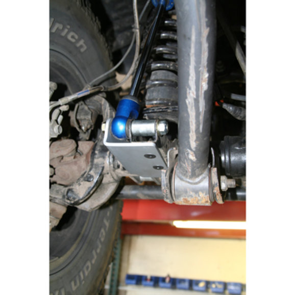 The JK front lower shock mount relocation kit features premium abrasive resistant powdercoat finish for maximum corrosion resistance. Manufactured from laser cut 3/16" steel and CNC bent for superior strength durability. Flush mount Grade 8 hardware provides an additional smooth skid surface to protect the shock eyelet assembly. Designed to move the lower shock mounts away from the frame rails to increase shock clearance under extreme articulation. Recommended for Fox Racing Shocks to properly clear the frame rail under extreme articulation.