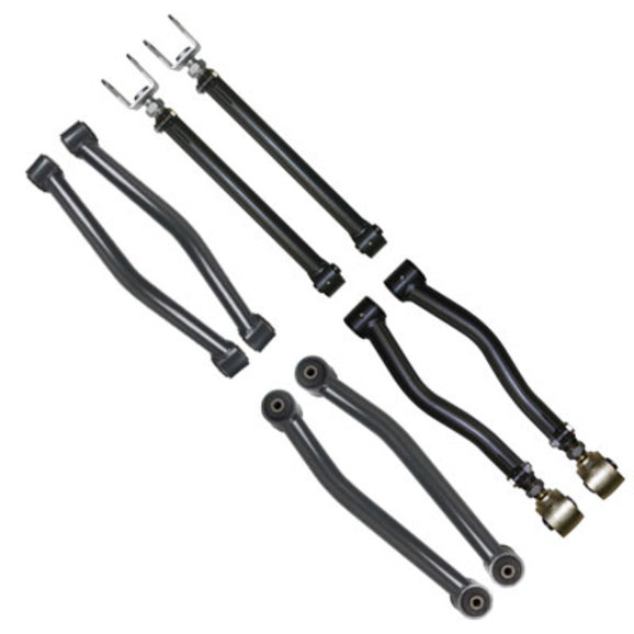 Synergy Suspension front/rear lower/upper control arms for 2 Door & 4 Door Jeep JKs feature an abrasive resistant powder coat finish for maximum durability and corrosion resistance. The Front/Rear Lowers & Rear Uppers are made from high quality crush resistant 1 3/4" X .188 Wall 1026 DOM tubing. Front Uppers are made from high quality crush resistant 1 3/8" X .188 Wall 1026 DOM tubing. Lower arms have a bent design and are manufactured to maximize ground clearance. These arms will also allow the use of OEM wheels with larger tires without the requirement of an additional wheel spacer. Features an OEM style bushing for extended permanence & minimized road vibration. Upper arms incorporate the tried and true Currie Enterprises Johnny Joints® for paramount performance. Integrated Synergy Suspension double adjuster sleeve & pinch bolt assembly allows for easy adjustment of control arm length without removing control arm mounting bolt. 100% bolt on components assures an easy, trouble free installation with the use of basic hand tools. Sold as a set of (8) complete arms.