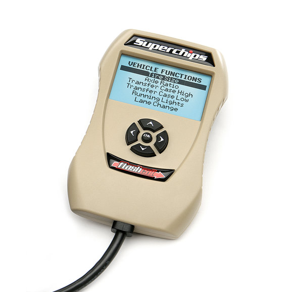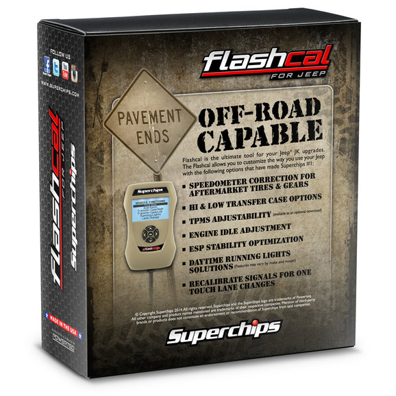 Introducing the all new Superchips Flashcal for the JK Wrangler. This thing isn't just some boring old 'programmer'. No, the Superchips engineers did their homework and loaded this marvel with the most sought after options JK consumers want. Great options like the ability to activate daytime running lamps, "one-touch" lane changes, enable a temporarily increased engine idle speed for winching, or clearing engine codes. The Flashcal also assists you in correcting the speedometer following gear and axle swaps, or when larger tires are installed. Left uncorrected, there can be a major degradation in the performance of the stability control (ESP), transmission shifting, and engine performance. So don't sweat the changes. Let the all new Superchips Flascal work for you!