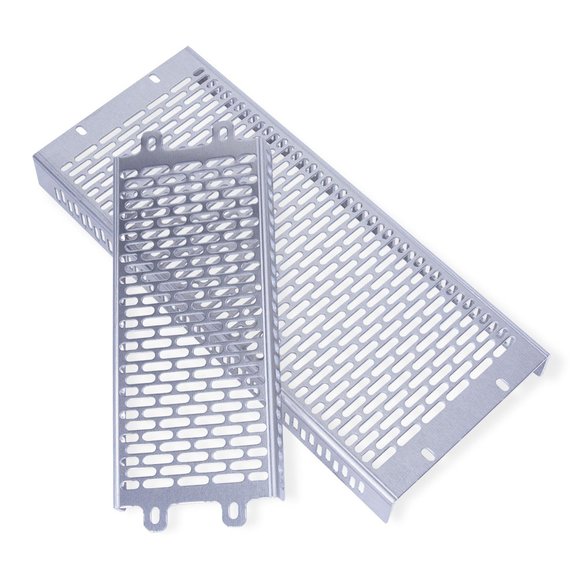 Flex-a-lite® oil cooler cover guards are made in the U.S., formed and punched from 1/8-inch aluminum. They securely mount on Translife® oil coolers using Flex-a-lite Gator Clips® (hardware is included) The design allows airflow, but protects the cooler from larger items that could potentially damage it. The covers also adds a cool, performance appearance to the oil cooler. They can be painted black to hide the cooler from being seen through the grille. This part number fits the 7 1/2 x 12 Translife® oil cooler (cooler PN 4116).