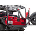 Cold-rolled 1/8" steel plate with ½"x ½" backing tube for strength and to minimize vibration, as well as for wire routing. The LED light comes with two 30" wire leads for easy hard-wire into OE harness. Finish is all black powder coated bracket and black ABS light bezel. Can be seen above up to 37" tires on Body Armor Swing-A-Way Carrier.