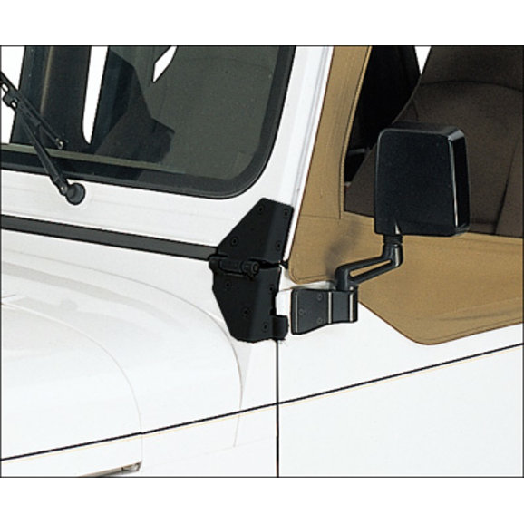 Rugged steel accessories wrapped in a rich Black Powder Coated finish. Black Accessories replace the standard painted items and really stand out! And as you can see they look awesome on light colored Jeeps. Black coated hardware is included in each kit. Has holes for CJ factory style mirrors.