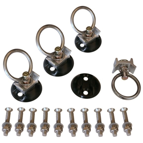 This versatile kit can be mounted in a wide variety of locations. Simply fasten the round powder coated black aluminum bases (using the hardware provided) to your desired locations and snap the Anchor Point Rings into the base. This tie down kit allows you to have the versatility of using just about any tie down strap with a hook to secure items. This kit includes (4) 2" bases, (4) anchor point rings, and all the required hardware. The anchor rings are extremely strong with an assembly break strength of 4000 lbs and work load limit of 1,333 lbs.