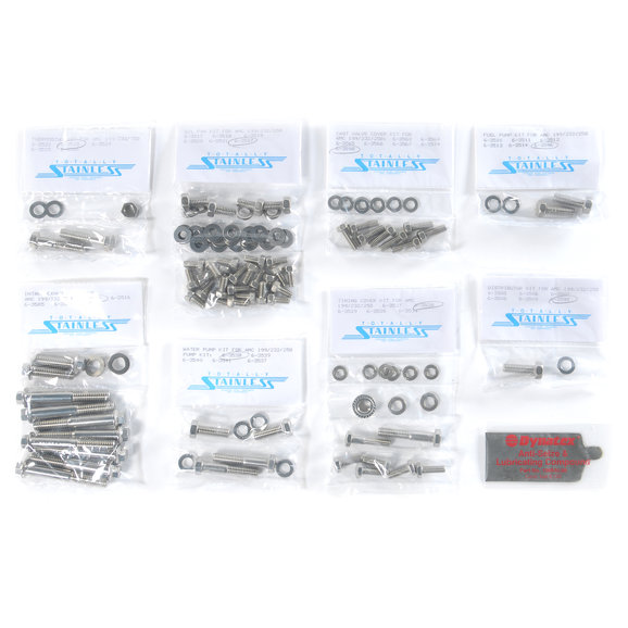 Stainless steel indented hex head engine bolt kit for 72-80 AMC 232 or 258 with aftermarket cast valve cover. Hardware for distributor,fuel pump,intake,oil pan,thermostat,timing cover, water pump, and valve cover