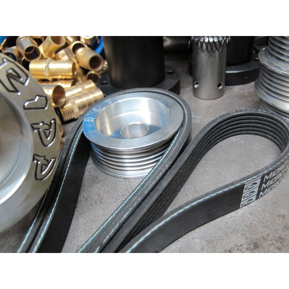 Have a RIPP Powered TJ? Reside at higher elevations? Want a little more power? Then this Altitude Pulley and Belt kit for is for you. The smaller pulley and belt kit will deliver 9-11psi at sea-level on your Jeep Wrangler 4.0L equipped with a RIPP Supercharger system. This pulley is designed for high elevation clients to correct the superchargers impeller speed to offset elevation boost loss. At sea level it spools the blower faster and with more authority. Best of all as long as you have your Diablo tool up to date, it can be driven safely from sea level to high elevation without tune issue or need to switch back. Made from 6061 billet aluminum will deliver faster spool up at sea level. This unit can be used with stock internals but the Diablo tuner, larger injectors, electronics and an intercooler are a must. Depending on your set up running more boost will require a re-tune of your electronics.