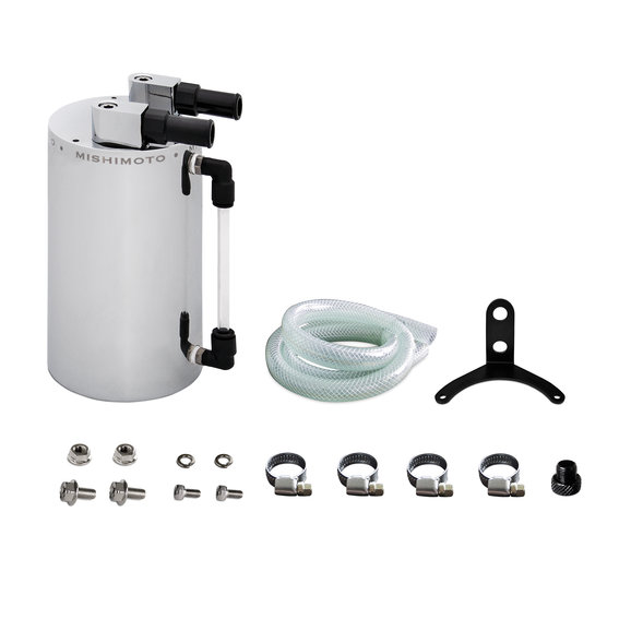 The Mishimoto Aluminum Oil Catch Can will prevent a harmful buildup of oil inside of the turbocharger, intake manifold, intercooler and piping. Our catch can prevents oil from getting into pressurized turbo plumbing and stops oil vapors from getting into the intake system that would ultimately lead to lower combustion temperatures and reduced overall efficiency. The polished Mishimoto Aluminum Oil Catch Can comes complete as a kit containing a mounting bracket, hose, all necessary clamps, fittings, and mounting hardware, for a perfect upgrade in performance and aesthetics for your car.