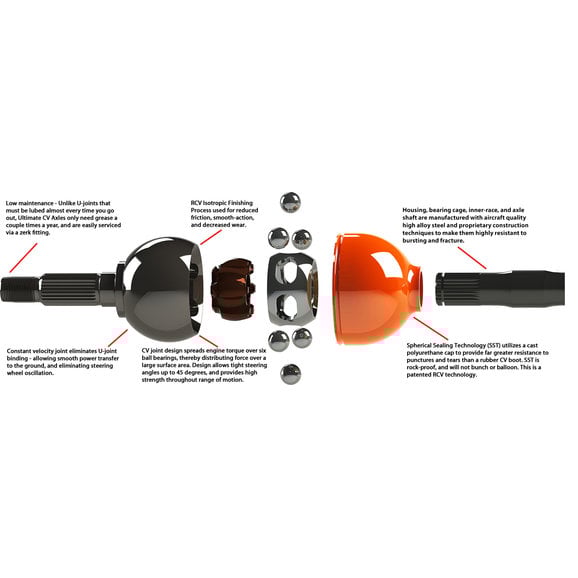RCV Performance Ultimate CV Axles simply replace your Jeep JK's weak Dana 30 U-joint axle shafts with a high-strength constant velocity design. Tests prove Ultimate CV Axles to be twice as strong as OEM Jeep axle shafts, and they're just as tough at a straight angle as they are at extreme angles where U-joints are weakest. Ultimate CV Axles also eliminate U-joint binding to allow smooth transfer power to the ground. Even if you have big tires and big power there are no worries. Ultimate CV Axles are low maintenance and operate with a smoothness you can feel whether off road or on the street. And these are all backed with a "No Questions Asked" limited lifetime warranty. Axle set includes right and left CV axle shafts, SST seals and installation tool, installation instructions, synthetic moly grease, and installation hardware. Black oxide coating is standard.