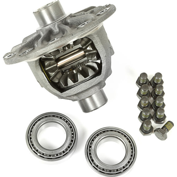 This replacement differential case kit includes a differential carrier case, an internal gear set(spider kit consisting of four shims, four gears, one differential cross shaft and one bolt), and a differential carrier bearing set consisting of a left and right bearing cone, bearing races, and ten 1/2 inch ring gear bolts.