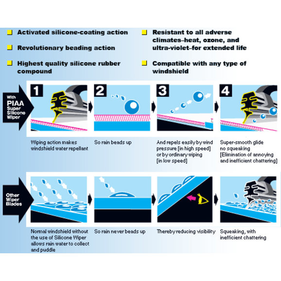 Now available in the hard-to-find Jeep sizes, the PIAA Super Silicone Wiper Blades outperform natural rubber with unsurpassed performance and durability. Experience smoother and quieter operation without the annoying wiper blade chatter. Combining aerodynamically shaped black powder coated steel frames with the latest in silicone technology, PIAA wipers give you better visibility in light drizzles and stormy weather. Clearly a good choice.