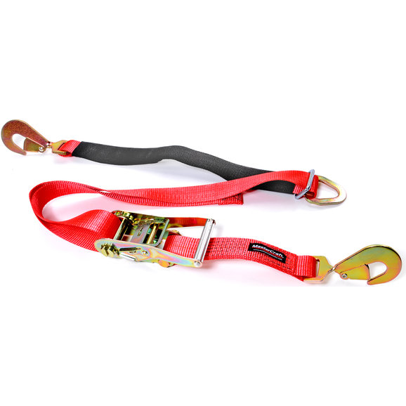 2" x 8' heavy-duty strap features wide handle ratchet, Snap hook at one end and Axle loop with protective sleeve at the other. 12" of adjustment. Rated at 10,000 pounds maximum load. Sold individually. 10706 Shown