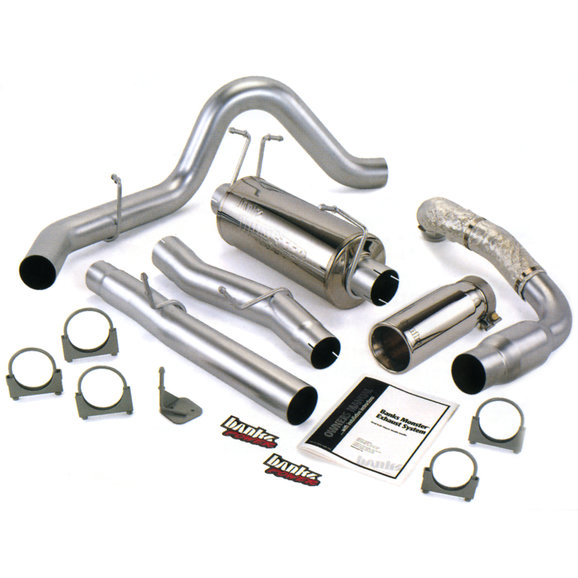 Monster exhaust system flows up to 91.5% better than stock and virtually eliminates backpressure. Formed of heavy-duty stainless steel, Banks 4" constant-diameter Monster exhaust pipes bolt behind the catalytic converter. The straight-through muffler with Banks' exclusive expansion chamber delivers a throaty, yet civil, exhaust note, and the handsome 5" polished-steel dual-wall tailpipe tip with a rolled edge stays mirror bright.