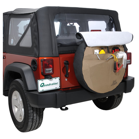Joey Pack utility tire covers provide additional exterior storage. Three large compartments are perfect for recovery items like shackles, snatch blocks, tow straps and gloves. Great for storing muddy and dirty items to keep the interior of your vehicle clean. Made from heavy duty vinyl backed khaki nylon for the inner compartments, and premium quality UV resistant black automotive vinyl for the exterior. Looks like a standard tire cover when closed for stealth security.