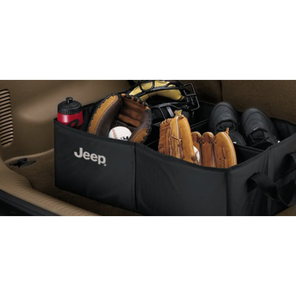 Cargo Tote is portable, made of Black vinyl, features the Jeep logo, and folds out to 24" X 15"