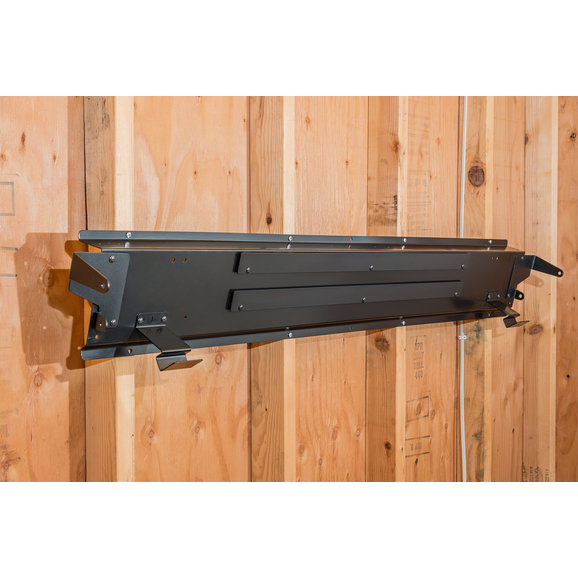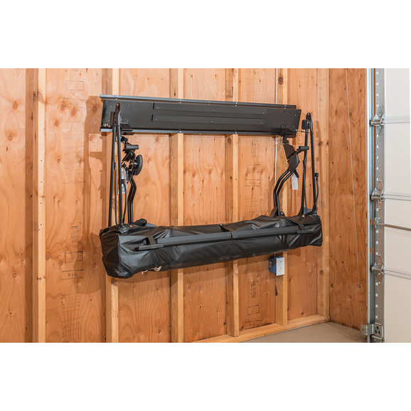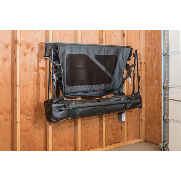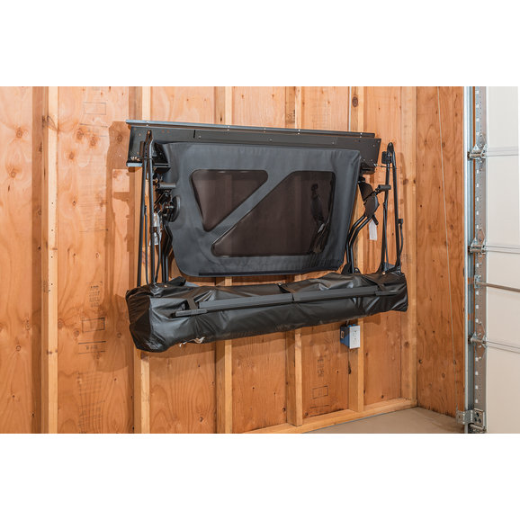Safe and convenient storage for original equipment soft tops. This exclusive design holds the metal bow assembly along with the fabric top and all three windows. All metal construction with black powder coat finish.