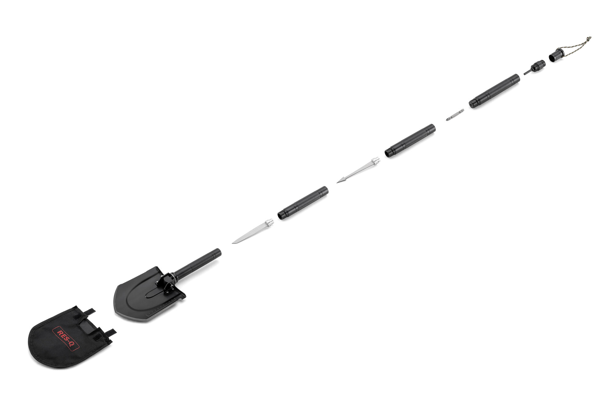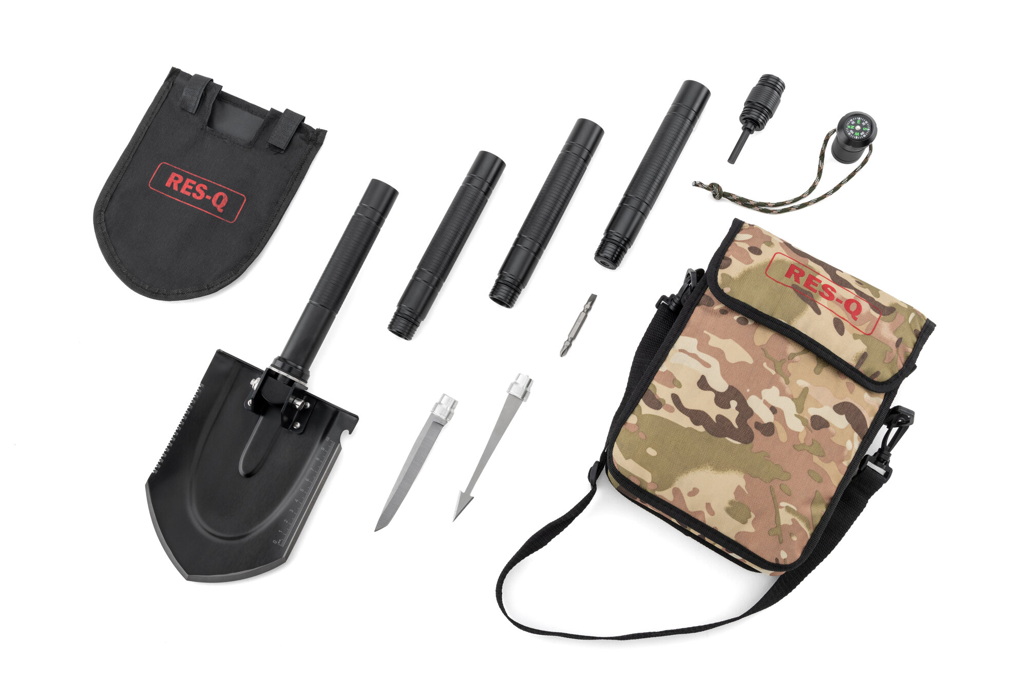 Besides the obvious function as a shoveling device, the Res-Q® Multi-Function Trail Shovel is the essential survival tool for off road adventures, camping, fishing, hunting, and backpacking. That's because it combines numerous tools into one compact design. Handles are CNC machined from high-strength aluminum with silicone O-rings to keep out dirt and moisture. Shovel blades are made with high-strength carbon steel and fully riveted for rugged durability. The included ballistic nylon protective pouch provides user safety and protection to the shovel head. The 15" long knurled handle and fully extended shovel head measure 24" long. Weighs only 2.2 lbs.