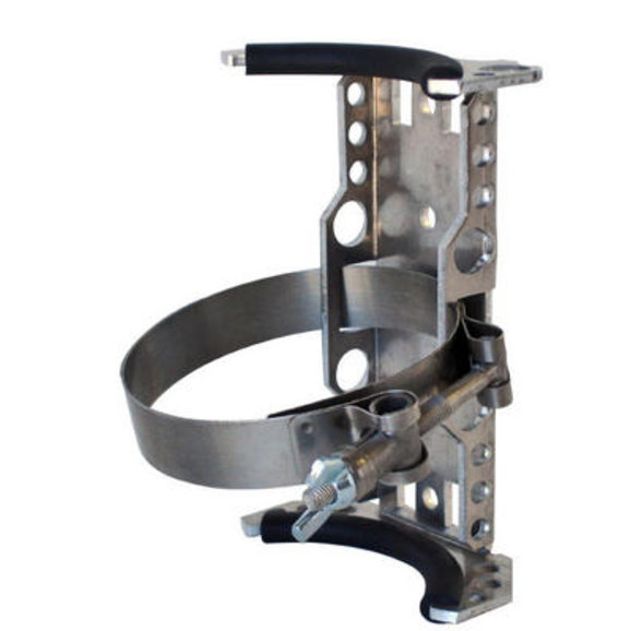 This little baby bracket is designed to hold our 20 oz. Jet Pak or Power Tank Mini bottles. The frame is aluminum and the holding strap is stainless steel with a cinch bolt latch. There are no tools needed to remove the bottle; just a twist of the wing nut. Rubber trim helps hold the bottle secure and protects the paint.