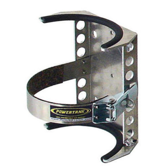 This unique bracket is designed for the 72 cu. in. N2 or HPA (high pressure air) bottle used on the N2 Jet Pak, the N2 Lovell T-Case Jet Pak and the N2 Shock Filler Kit. The stout aluminum frame and the 1" wide stainless steel strap with locking latch is meant to hold up to the abuse of competition offroad vehicles. Rubber trim holds the bottle secure while protecting the paint and aluminm from damage. This is the smallest bracket in our line that works with our rollbar clamps as a direct fit. (Note: The description of this item in our catalog is incorrect.)