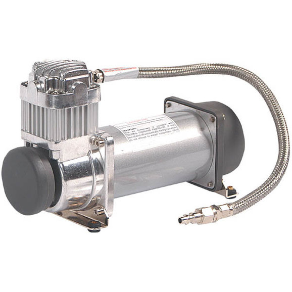 The 400H is a hardmount compressor that pumps a massive 2.54 CFM flow at zero PSI head pressure. Features include a standard stainless steel braided leader hose with ¼quick connect stud for easy attachment to a coil hose, removable & replaceable dual filtration air filter element, insulated wiring for simple installation and a heavy duty ON/Off switch for ease of operation.