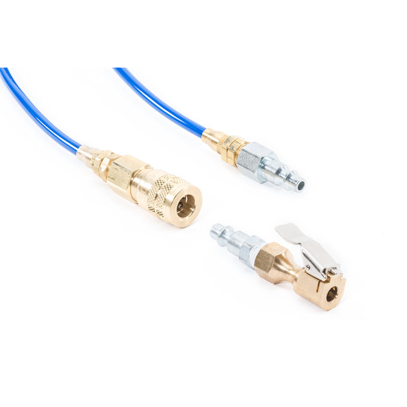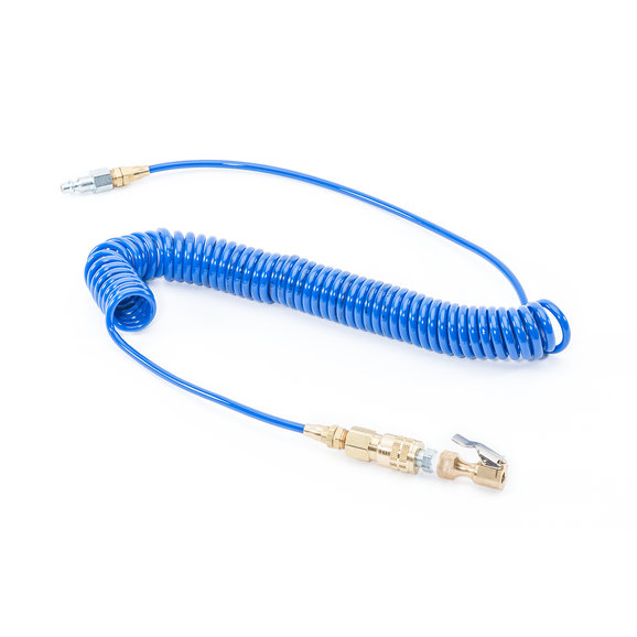 Off Road Only Tire Inflation Kit. Kit comes completely assembled and ready for use as shown. The 20 foot coiled air hose is a soft polyurethane product that does not kink or crack in cold weather. The fittings are all brass and the coupler is a "Automatic, push to connect" coupler, to ease in installing the plug. The tire end is a locking chuck that works with most all offroad wheels where you can push the coupler straight onto the tire valve stem. This Kit is specifically designed for use with the Wrangler JK York Air Kit.