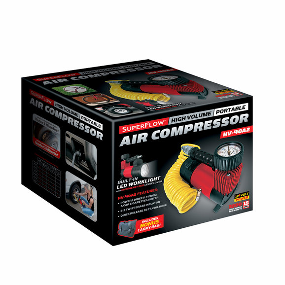 HV-40A2 is a real smooth and well balance 12 volt portable air compressor with LED light. The 16 ft. coil hose that is included has an easy screw-on air chuck that makes it useful. The switches are separate for the pump and LED lights. The handle is a metal heat shield for the output. This streamlined, sturdy air compressor is perfect for cars and other standard-sized vehicles and is designed for day-to-day use, from blowing up balls to inflating low tires. The HV-40-A2's powerful 12-volts and 150 PSI capacity is comparable to other higher-priced compressors. This unit is unique because of its powerful motor and LED light that has a straight stream or strobes. Flow up to 30 LPM (liters per minute). Features include: 10 foot power cord to reach around the vehicle, detachable hose 16 feet long to connect from compressor to tire, and built in pressure gauge. The unit weighs only 6.1 lbs, and has a rubber leg base to prevent movement when in use. Adapters and carrying bag included.