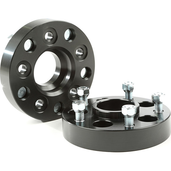 This pair of black 1.25 inch aluminum wheel adapters from Rugged Ridge let you install 5x5-inch wheels onto Jeeps with a 5x4.5-inch bolt pattern. These hub centric adapters move your wheels out to help fit wider tires and give your Jeep a wider track and improved stability. Constructed of double anodized black extra thick 6061T6 aluminum for long life and extra corrosion resistance. All hardware is grade-8 for extra strength.