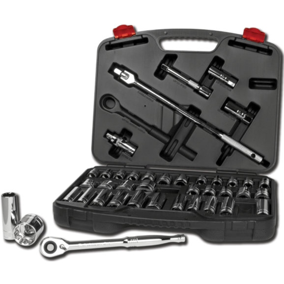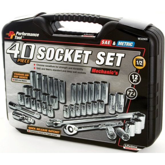 - Set contents: 1pc. 1/2" dr. quick release ratchet, 1pc. universal joint, 2pcs. 3 and 6" extensions, 2pcs spark plug sockets, 25pcs SAE and metric std. sockets and 20pcs. SAE and metric deep sockets.