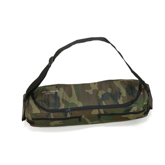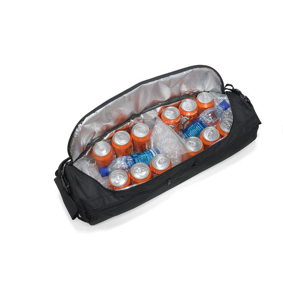 The Trail Tuff Cooler Bag is very versatile. In your Wrangler it attaches to your sport bars with the adjustable straps and sits on the inside fender behind the front seat. Does not interfere with back seat passengers, saving room. Or can be attached easily to racks with bungee cords using the D Rings on the bag. Either way it is secure during off road use. The cooler bag is heavy 640 denier UV protected nylon. The insulation is mildew proof. A shoulder strap is provided for ease of carrying when out of the vehicle. The cooler bag will keep food and drinks cool all day with just three quart sized freezer bags of ice. Blue ice can also be used. Holds enough lunch for two. Two pockets are provided for silverware and napkins. Available in black or camouflage. Measures 24"L 8"W 5"H