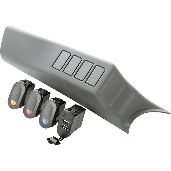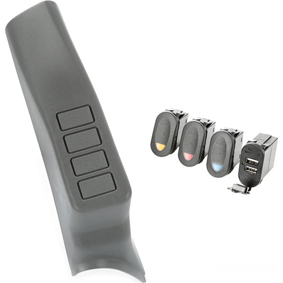 This 4 switch A-Pillar pod kit from Rugged Ridge includes an A-Pillar pod, 3 marine style 2-position rocker switches (1 each, red, amber & blue), and a combo rocker switch USB connector. Our A-Pillar Pod has the textured molded finish just like the factory plastic pillar cover it replaces. It snaps into place for a factory look.