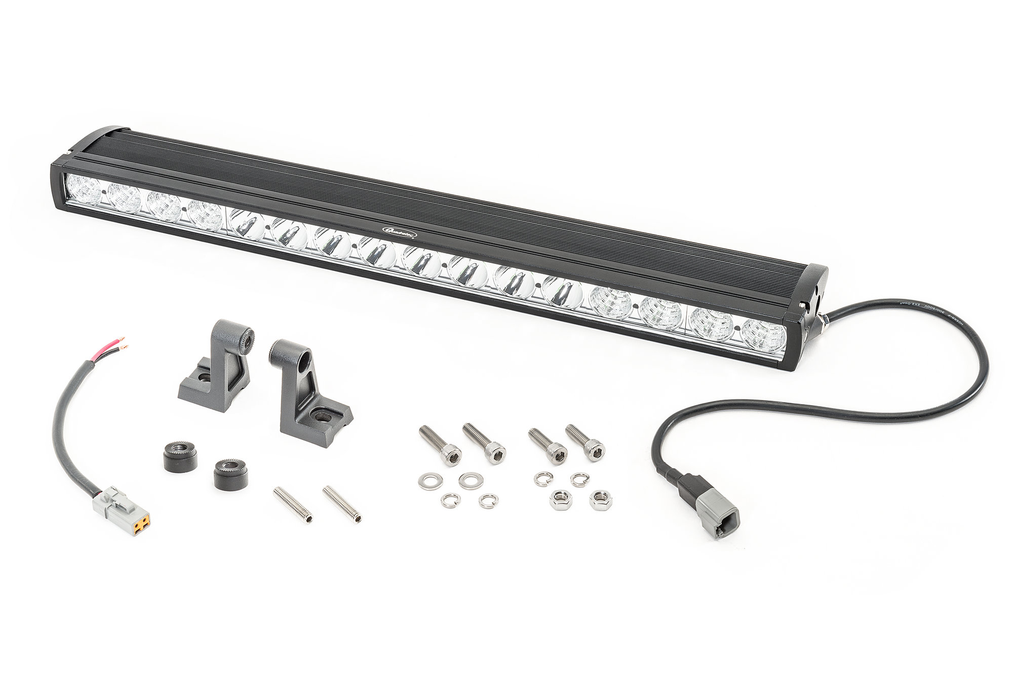 die cast aluminum housings to endure the rigors of off-road use. Each LED exhibits super bright white 6000°K output that's close to natural sunshine with an average lifespan of 45,000 hours. Industry standard Deutsch-style connectors feature weather tight seals for years of trouble free service. Assemblies have an IP69 waterproof rating, 13,760 lumens and feature stainless steel hardware and mounting posts. All bars include mounting feet with hardware for do-it-yourself custom installations. Available with 10° driving beam, 30° flood beam pattern and combination patterns. The 10° narrow beam is best suited for driving at higher speeds that require longer projection with less peripheral lighting. The 30° flood beam pattern provides more peripheral lighting and is well suited as a multi-purpose light and for off road trail riding at lower speeds. Bars with combination beam patterns use 8° spots and 25° floods providing the best of both worlds. Lamps are not legal for use