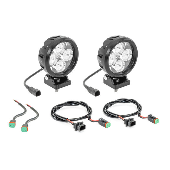 Quadratec's exclusive LED light kit that combines the industry-leading power of 10W American made Cree LEDs into compact housings. With such an efficient low current draw, our kits are designed to use the existing factory fog lamp harness and control. These truly plug-n-play kits provide a quick and easy installation of auxiliary off road lighting with no additional wiring, cutting or spicing. Our kits include one pair of auxiliary off road lamps and custom plug-n-play harnesses that plug directly into your existing factory fog lamp harness. Each lamp includes a 24 long extension with industry-standard Deutsch-style and Mopar compatible connectors to allow for lamp relocation. Each LED exhibits super bright white 6000°K output that's close to natural sunshine. The durable, powder-coated aluminum housings are built to endure aggressive off-road use and feature stainless steel hardware and mounting posts. Available with choice of 10°driving beam or 30° flood beam patterns. The 10° narrow beam is best suited for driving at higher speeds that require longer projection with less peripheral lighting. The 30° flood beam pattern provides more peripheral lighting and is well suited as a multi-purpose light and for off road trail riding at lower speeds. Includes Quadratec's 3 Year Limited Warranty. Lamps are not legal for use on public roadways and are intended only for off-road use.