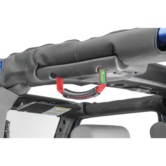 Our sturdy grab handles are constructed of heavy nylon webbing with vinyl grip handles and metal grommets and provide three applications in one clever design. Developed specifically for Wrangler JK to install to the upper windshield corner ("A" pillars) or JK Unlimited second seat sport bars using existing bolts. There's no drilling and both applications provide helpful assistance when getting in or out of the vehicle. These same grab handles install in minutes to all JK front headrests posts with no tools to assist backseat passengers when getting in or out of the vehicle. Available in black or red. Sold in pairs.