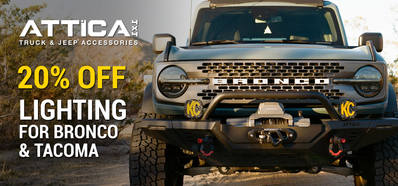 Save 20% on Attica Lighting for Bronco & Tacoma. Offer valid on select Attics purchases made from APR 24 - JUN 1, 2026.
