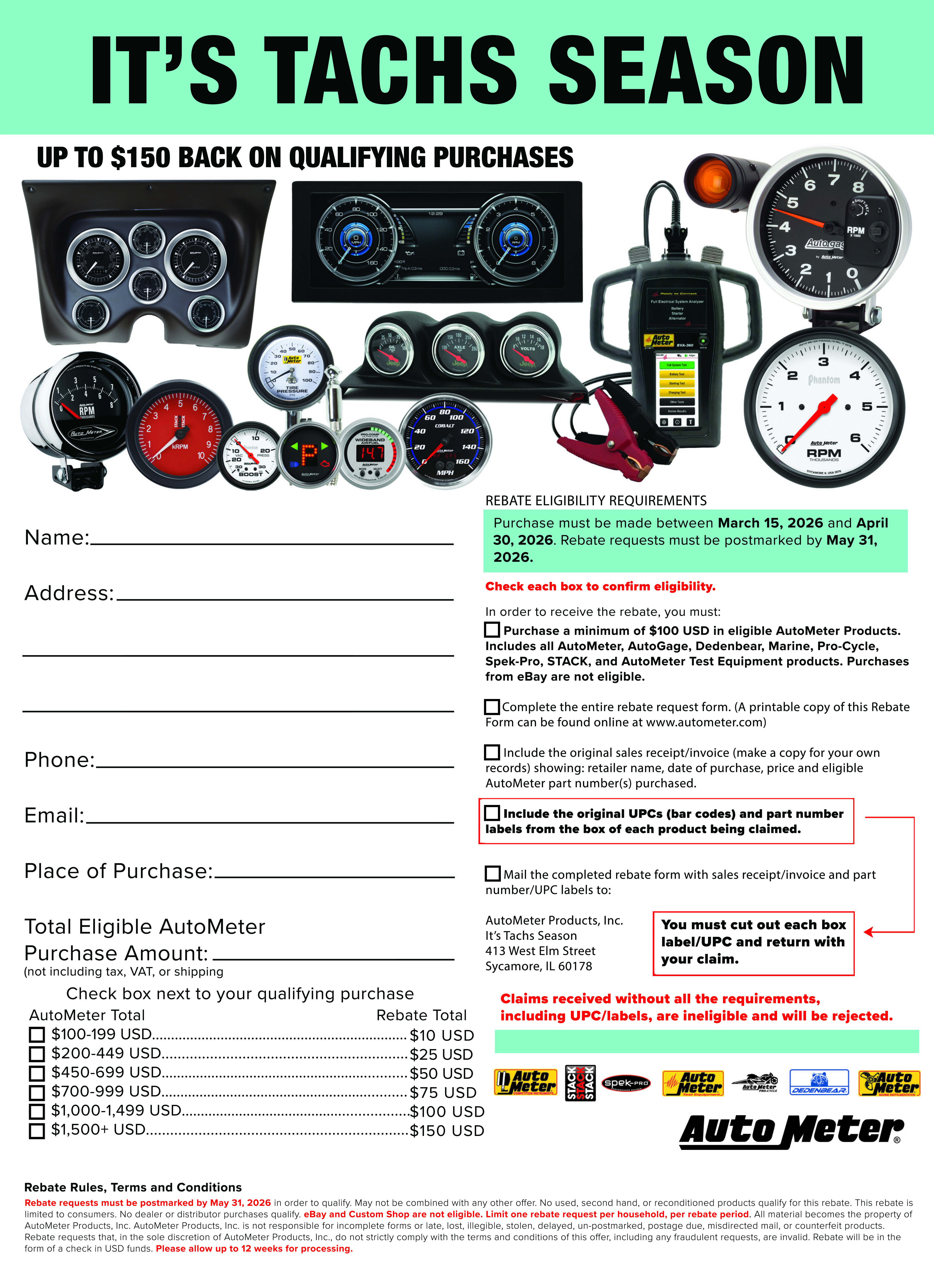 Get up to $150 Back on Select Autometer Products. Offer valid on select Autometer purchases made from MAR 23- APR 30, 2026.