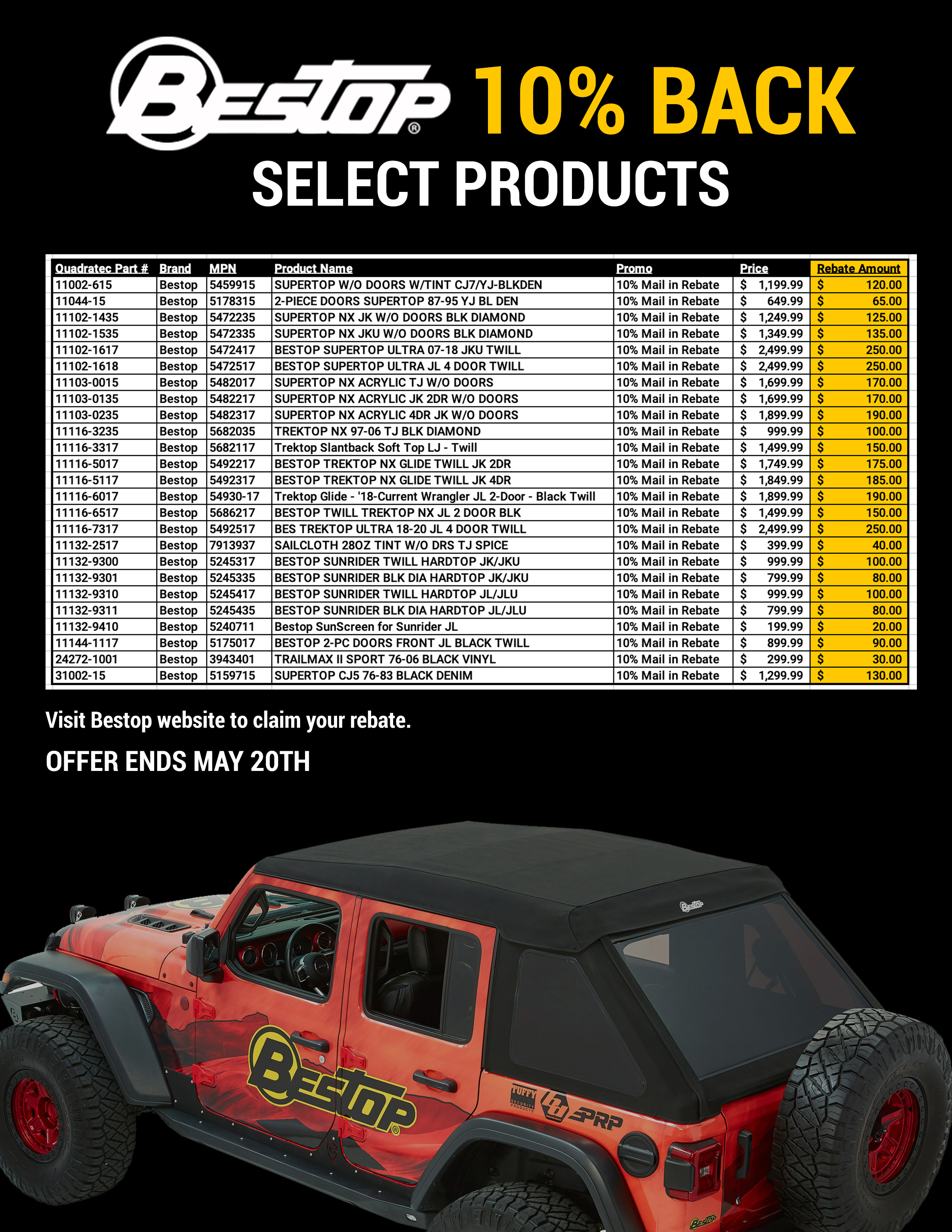 Get 10% Back on Select Bestop Products. Offer valid on select Bestop purchases made from MAY 9- MAY 20, 2025.