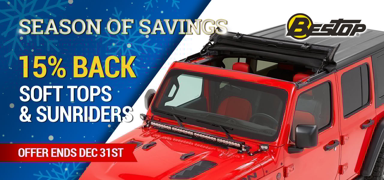 Get 15% Back on Bestop Soft Tops and Sunriders. Offer valid on select Bestop purchases made from DEC 18- DEC 31, 2025.