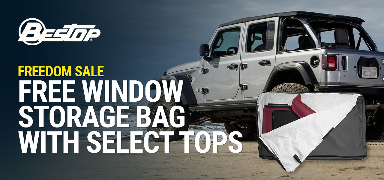 Purchase a qualifying Bestop soft top and become eligible to receive Free window storage bag . Offer valid on select Bestop purchases made from JUN 30 - JUL 9, 2023.