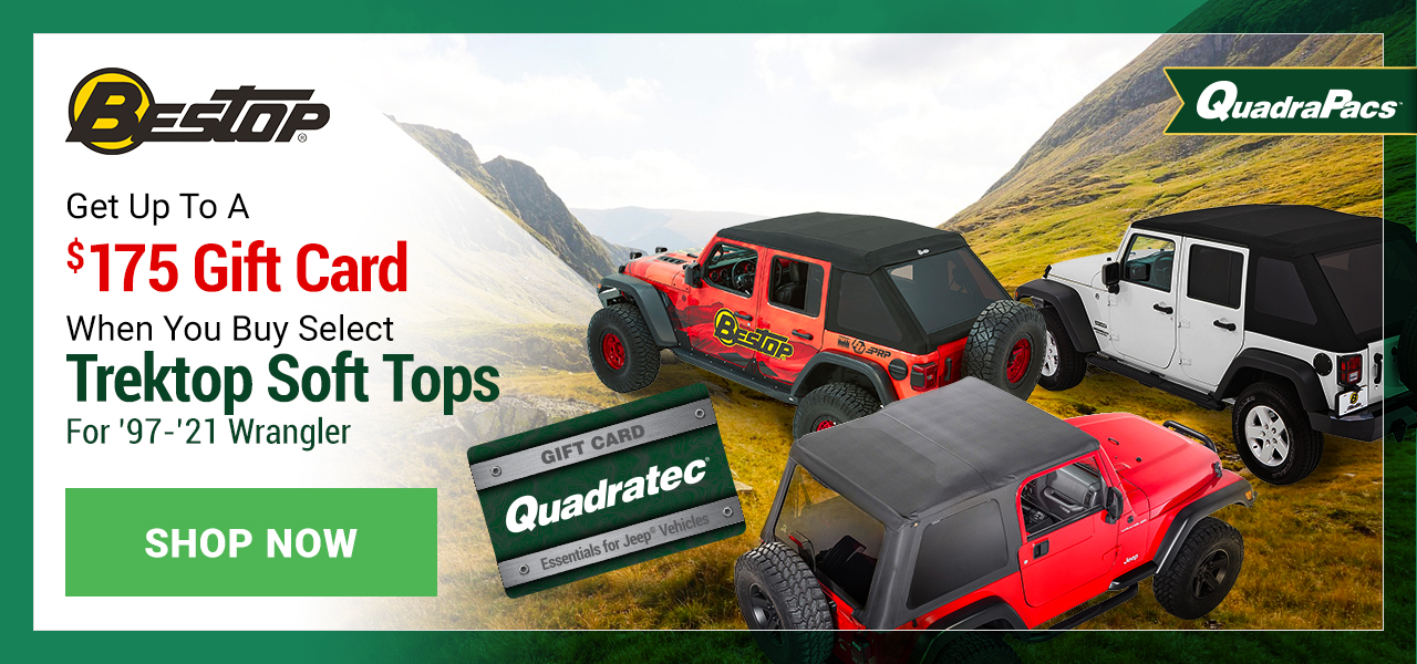 Purchase a qualifying Bestop Soft Top and receive up to a $175 Quadratec gift card. Offer valid on select Bestop purchases made from MAY 01- JUN 30, 2021.
