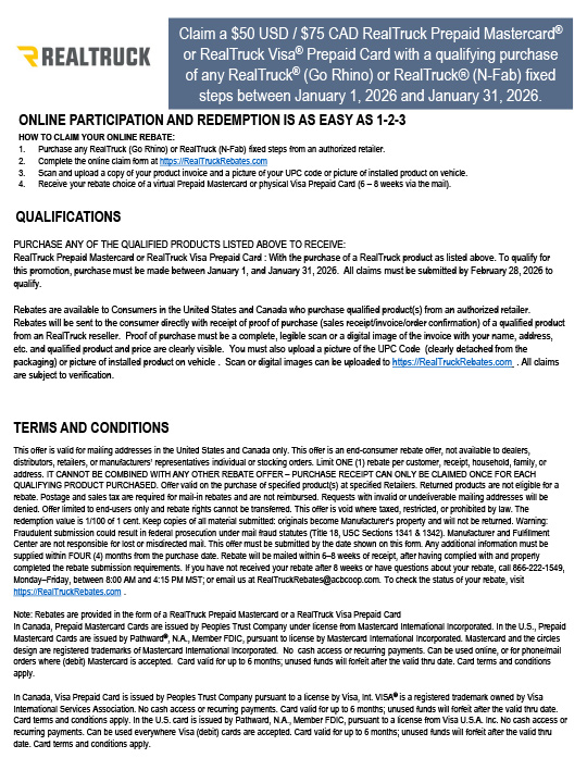 Get $75 Back on Go Rhino Side Steps. Offer valid on select Go Rhino purchases made from JAN 1- JAN 31, 2026.