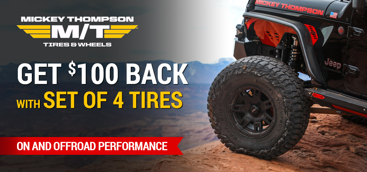 Get $100 Back with Purchase of 4 Select Mickey Thompson Tires. Offer valid on select Mickey Thompson purchases made from OCT 1- NOV 15, 2025.